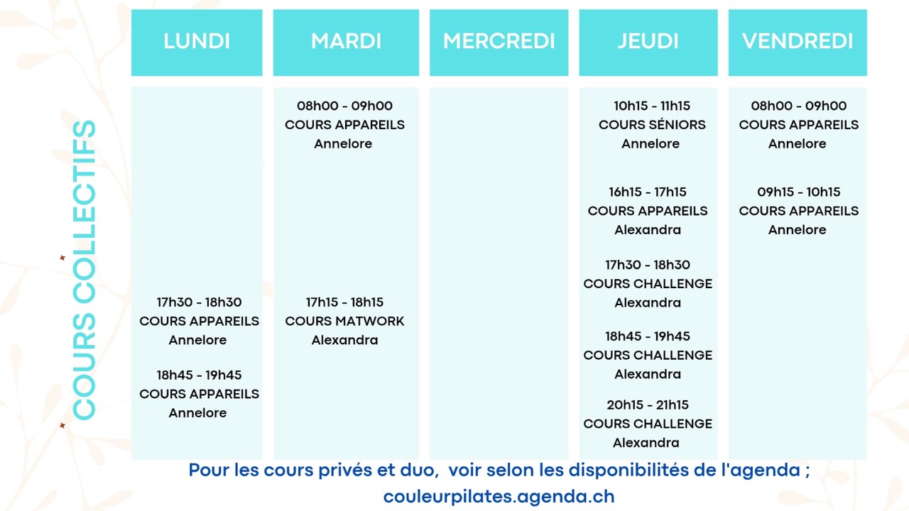 Le studio est accessible uniquement sur rendez-vous, selon les créneaux disponibles dans l'agenda en ligne et pendant les horaires des cours collectifs indiqués ci-dessus. Seuls les clients enregistrés dans notre base de données peuvent réserver directement leur place en ligne. Pour réserver une première leçon, nous vous invitons à nous contacter.